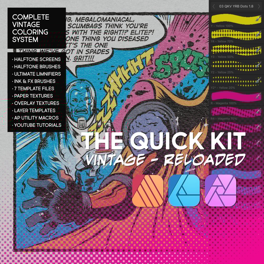 This is a vintage comic coloring system for the Affinity Design Suite! The most recent expansion includes a new set of CMYK halftone brushes, new texture & overlay assets, and all new vintage color separation macros.